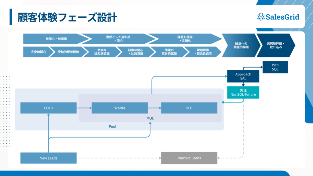 | 4. ナーチャリング・関係構築 | 検討段階の顧客を育成し、商談化への準備を進める | 情報提供、課題ヒアリング、BANT確認 |
