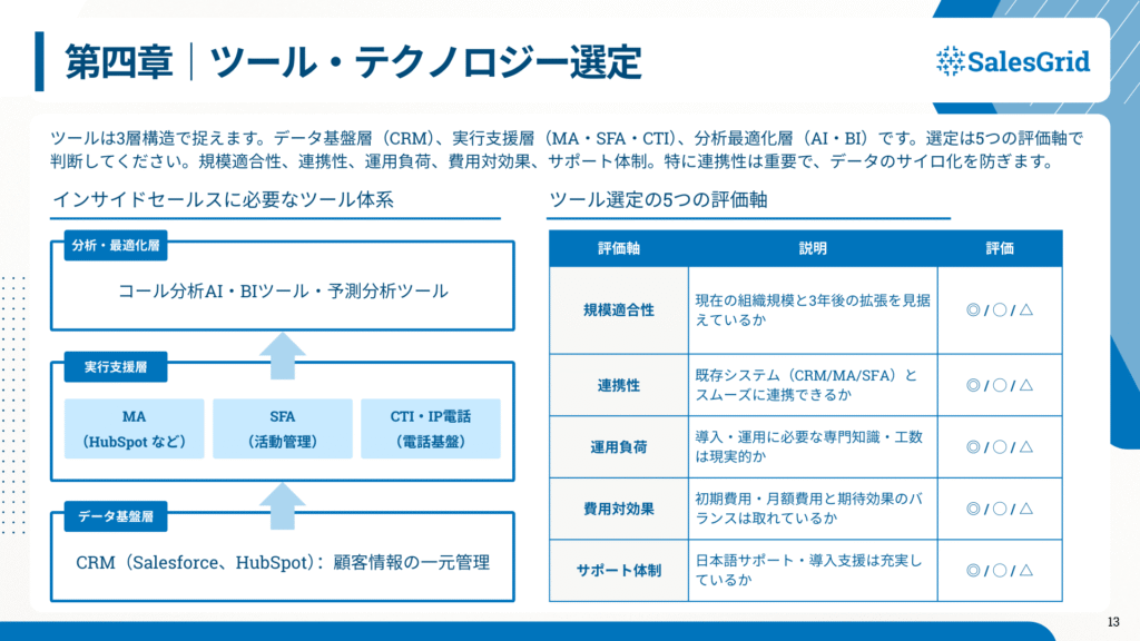 本記事は、SalesGrid「インサイドセールス立ち上げ完全ガイド」シリーズの一部です。テクノロジー基盤の構築をさらに進めるために、以下の関連記事・資料もぜひご参照ください。