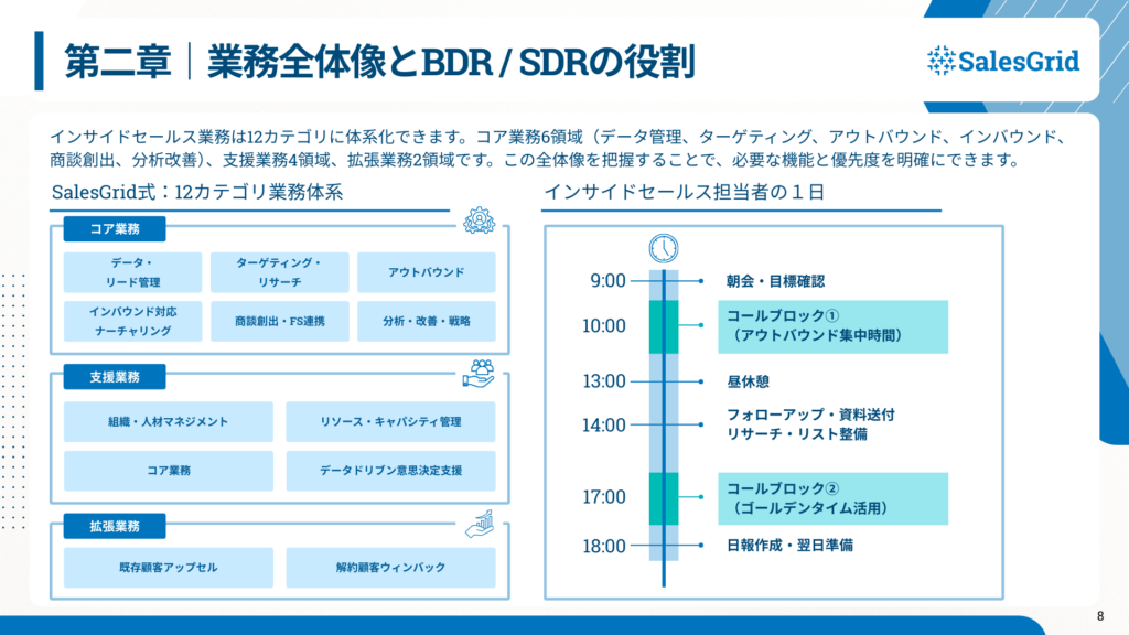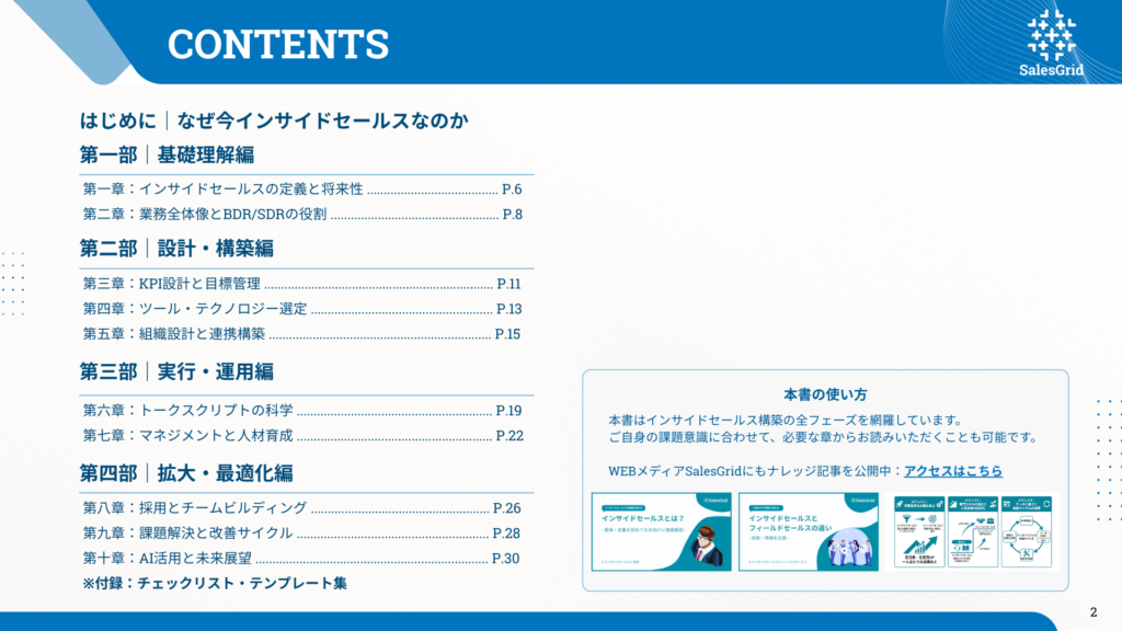 SalesGridが「営業を科学し、成果を最大化する」 というコンセプトのもと、 知見を凝縮しました。 理論だけでなく、明日から使える テンプレートやチェックリストも豊富に収録していますので 「読んで終わり」ではなく「即実践」できる内容です。